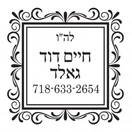 Ornamental frame design, used for a sefer, book or anything else. Can be customized in Hebrew or English. Fits name and phone number and will be customized as shown on image.