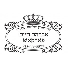 An ornamental oval frame design with a crown, for a sefer, book or anything else. Can be customized in Hebrew or English. Fits name and phone number as shown on image.