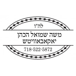 A classic oval frame design for a sefer, book or anything else. Can be customized in Hebrew or English. Fits name and phone number as shown on image.