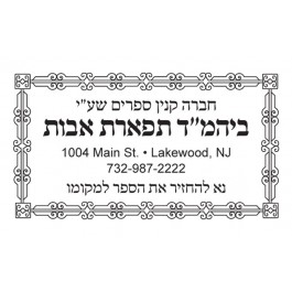 A frame design for a sefer, book or anything else. Can be customized in Hebrew or English. Can be used for a name, address and phone number or up to five lines of text.