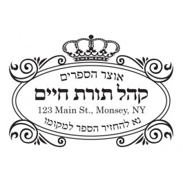 An ornamental oval frame design with a crown, for a sefer, book or anything else. Can be customized in Hebrew or English. Fits name and phone number as shown on image.
